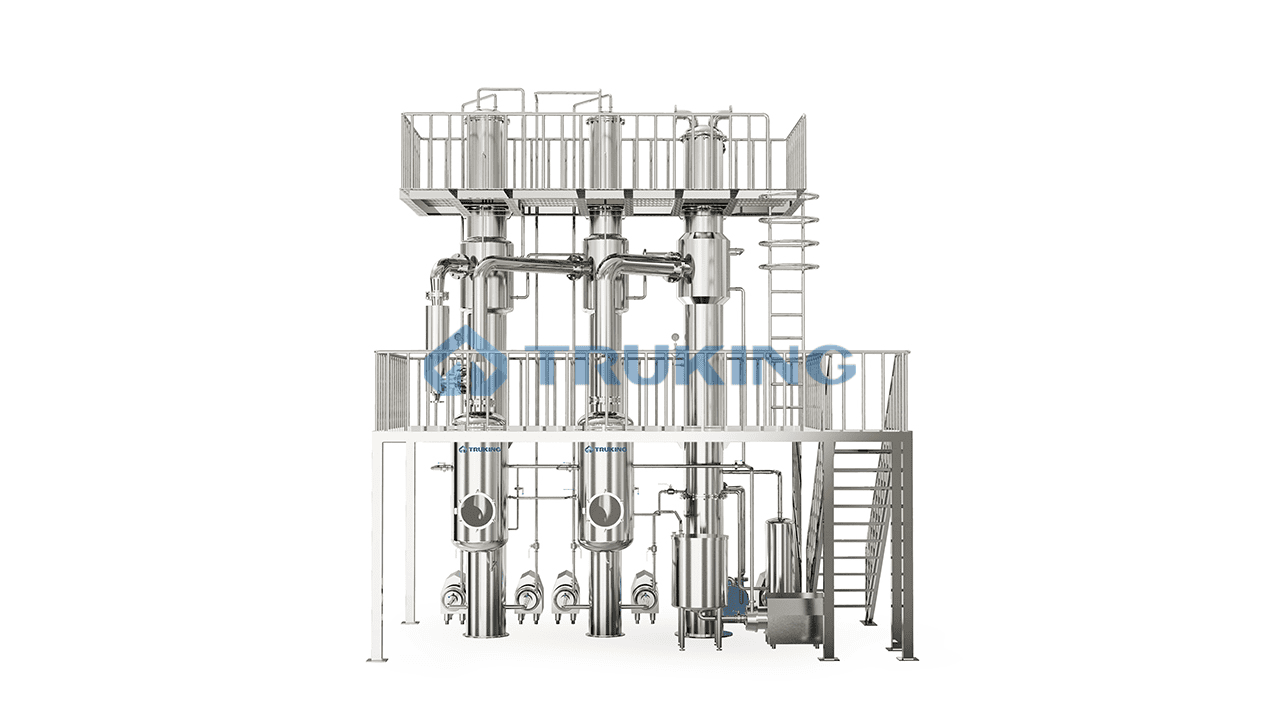 Жидкий материал поступает в концентратор сверху, равномерно распределяясь по внутренней стенкенагревательной трубки, естественным образом стекая вниз в виде пленки. Концентрация материала происходит под воздействием тепла. После этого концентрированная жидкость и вторичный пар поступают в сепаратор для разделения. Вторичный пар выходит из верхней части сепаратора. Часть вторичного пара поступает в тепловой насос, а другая часть направляется в нагреватель вторичного эффекта для экономии энергии.